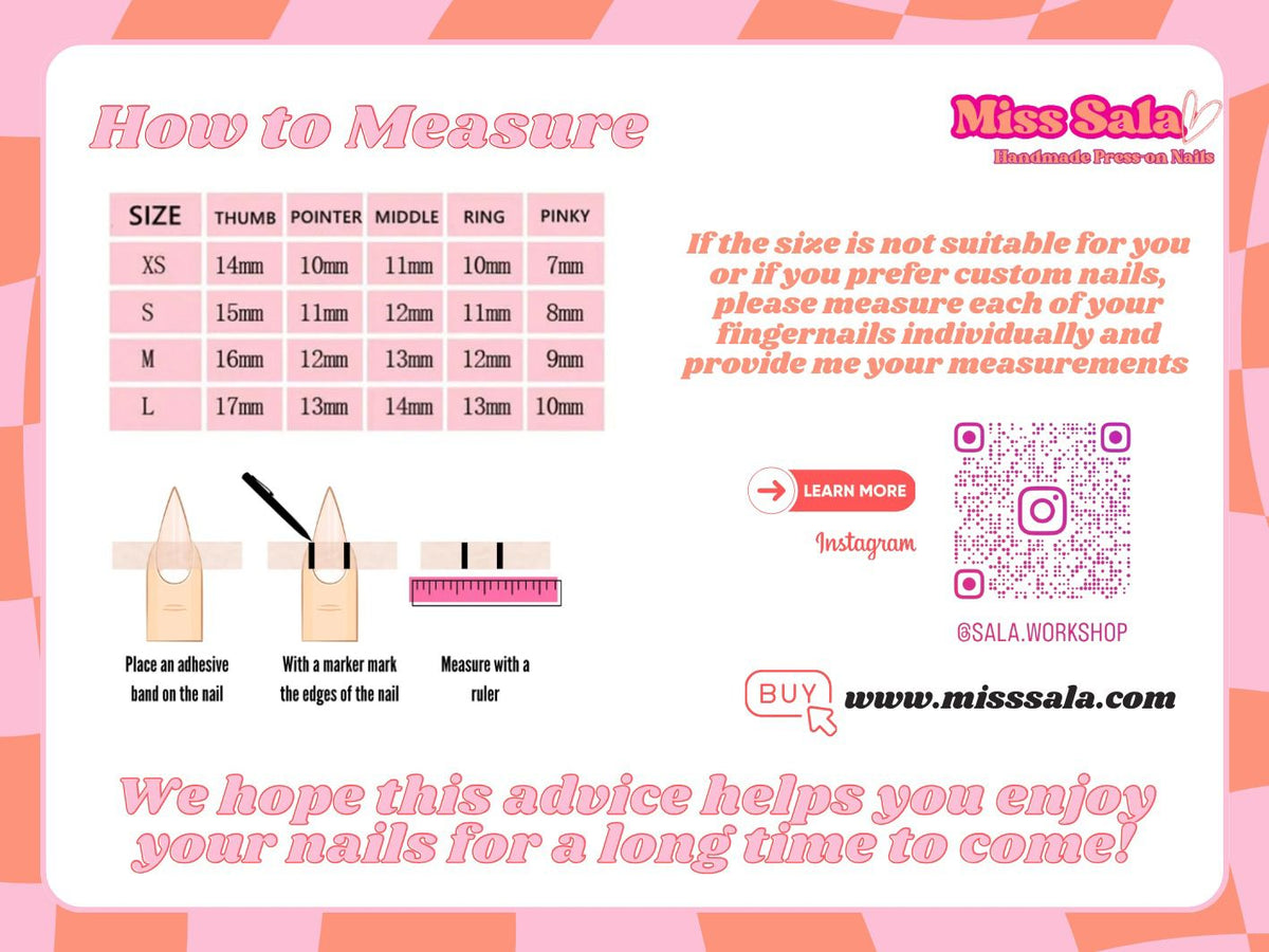 At Miss Sala Nails, we prioritize hygiene and quality, which is why all sales of our high-quality, handmade press-on nails are final. Due to the custom nature of our products, we do not accept returns, exchanges, or refunds.